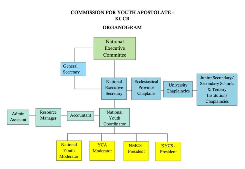 The organogram deals with the chain of command on who reports to whom, so as to bring about harmony and effective and efficient communication in the implementation of tasks inherent to the Commission for Youth Apostolate as per the policies of KCCB.